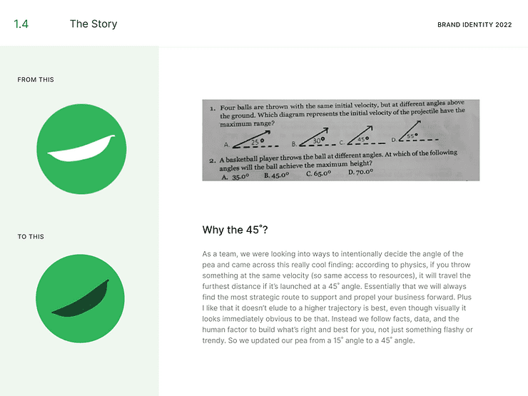 We started by turning the pea pictorial mark on an upward more positive slant, the goal here is to make an ode to positive trajectories and growth. Keeping its base shape and colour to retain years of building up the brand. Additionally, we updated the colour of the negative space of the pea to be darker: creating a bolder, more cohesive and refined look. The shape of the pea was slightly refined to reduce noise and make odes to the shapes of the new wordmark. The refined mark isn’t flashy, it’s easily identifiable and it will pair nicely with our clients/partners logos without demanding to be the centre of attention.